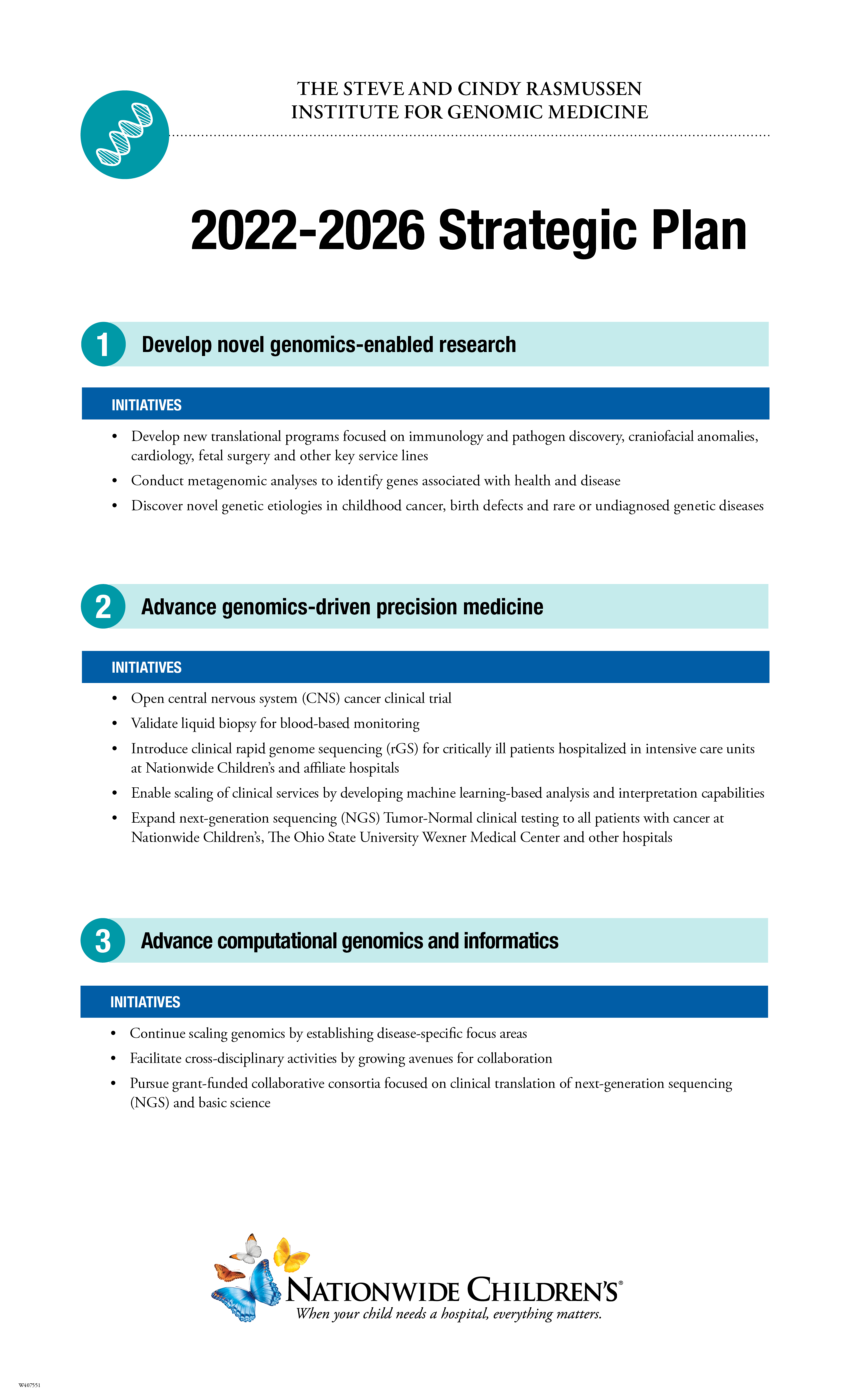 The Steve and Cindy Rasmussen Institute for Genomic Medicine’s own strategic plan supports the critical role genomic research plays in the overall strategic plan for the hospital. It describes how the Institute’s core capabilities will becoming even more deeply integrated throughout Nationwide Children’s over the next five years.